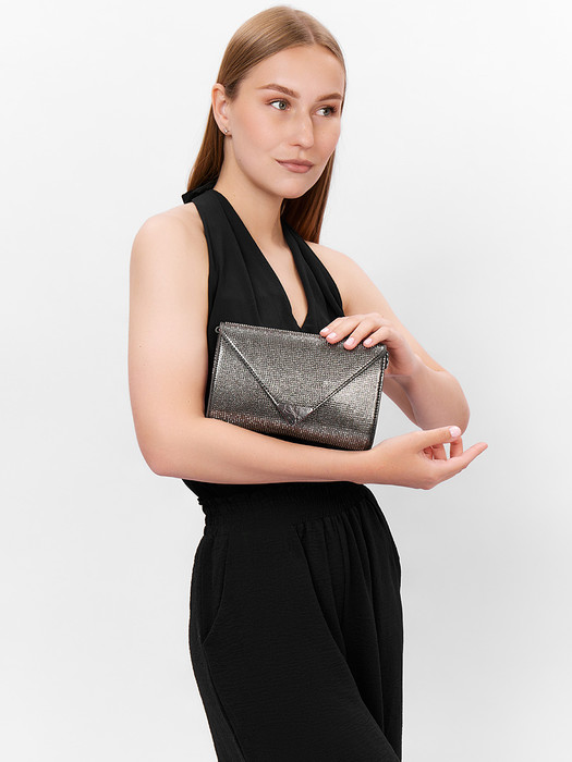 Сумка женская выполнена из натуральной кожи и декоративных камушков. Детали: 1 ручка  до 120см. Внутри изделия: под клапаном на магнитной кнопке 1 отделение на молнии, 1 карман на молнии, 1 открытый карман. Брендированная подкладка из полиэстера. Металлическая брендированная фурнитура серебристого цвета. В комплекте фирменный пыльник.