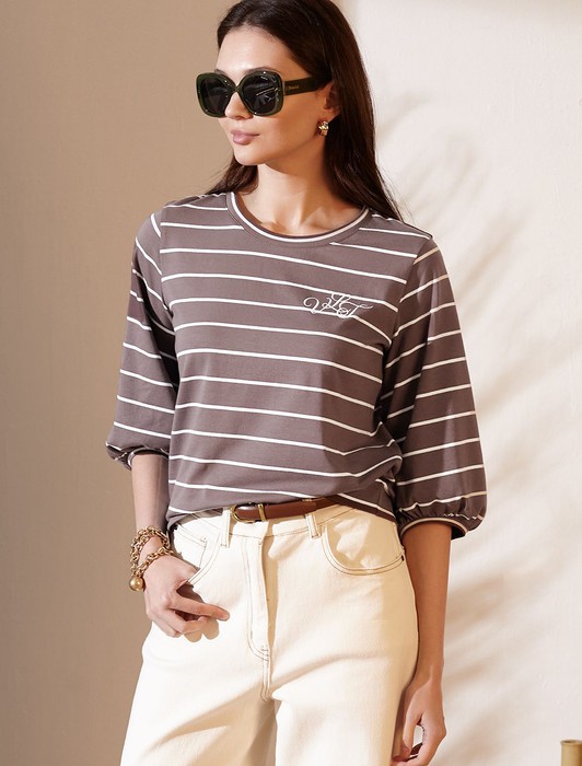 Состав: 92%Хлопок 8%ПУ Плотность: 170 Г/м2Свободный лонгслив кофейного цвета в белую полоску с рукавом средней длины выполнен из премиального хлопка с добавлением эластана, плотностью 170 Г/м2, что обеспечивает комфорт и приятные тактильные ощущения. Полоска - придает изделию легкую текстурность, аккуратная вышивка в виде букв логотипа бренда добавляет стиля и индивидуальности, а круглый ворот создает универсальный образ, который подойдет для повседневного использования. Объемные рукава буфы средней длины делают этот лонгслив женственным и изящным.Такой лонгслив идеально подходит для весеннего и летнего сезона благодаря легкой и дышащей ткани. Представленная широкая размерная линейка позволяет выбрать оптимальный вариант на любую фигуру, в том числе на плюс-сайз, обеспечивая свободу движений и удобство на каждый день. Этот комфортный тонкий джемпер станет отличной базой в гардеробе, сочетаясь с различными стилями одежды и создавая простой, но эффектный образ.