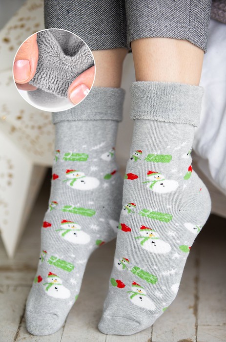 Женские носки с отворотом созданы, чтобы дарить комфорт в прохладные осенние и зимние дни. Махровые носки с новогодним принтом Снеговики согреют и создадут атмосферу торжества.