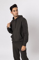 Мужское худи свободного силуэта из трикотажного футера с теплым подчесом. Круглая горловина с капюшоном, длинные рукава на манжетах, слегка спущенная линия плеча, пояс из рибаны – худи удачно сочетает комфортный дизайн и отличное качество!