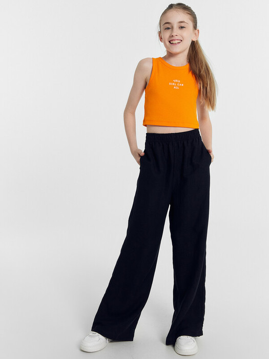 Брюки для девочек широкие. Посадка высокая. Пояс цельнокроеный из основного полотна, застрочен с эластичной тесьмой RV40 внутри, по поясу проложены отделочные строчки. В боковых швах обработаны карманы. Низ брюк обработан швом в подгибку.
