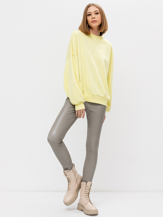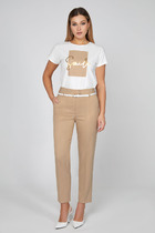 Брюки прилегающего силуэта из экокожи. Длинна классическая. Линия талии значительно завышенная. Вытачки на задней части формируют современный крой. На уровне колена – вертикальный шов. Пояс на жаккардовой эластичной резинке. Хит продаж