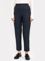 Брюки женские прямого силуэта из ткани. На деталях переда карманы с отрезным бочком. Пояс отрезной состоит из двух частей, задняя часть пояса присборена на резинку. Посадка средняя.
