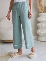 Брюки прямого силуэта зауженные к низу. Пояс отрезной. Задняя часть пояса присборена на эластичную тесьму. По поясу настрочены шлевки. На деталях переда обработана имитация карманов. На правой передней половинке отстрочена декоративная строчка - имитация гульфика. В боковом шве застежка на потайную молнию. На задних половинках в районе колен декоративные горизонтальные подрезы. Нижние срезы брюк обработаны швом вподгибку на 2х игольной плоскошовной машине.