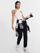 Пояс отрезной с эластичной тесьмой внутри. По переду пояса с внешней стороны пробиты петли и втянут шнур. По переду обработаны карманы-хулиганы, подкладка кармана из основного полотна. Нижние срезы брюк обработаны швом вподгибку с эластичной тесьмой внутри.