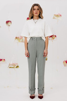 Брюки свободного силуэта. Пояс цельнокроеный, с втаченной эластичной тесьмой, отстрочен. Карманы в боковом шве. Низ брюк обработан в подгибку с эластичной тесьмой.