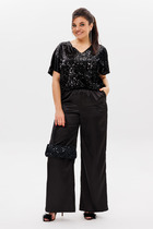 Брюки свободного силуэта с высокой посадкой в пол. Пояс цельнокроенный с эластичной тесьмой внутри 50RV. По поясу сделаны 2 отделочные строчки.