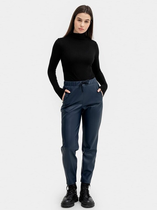Свободные женские брюки из экокожи. Длина стандартная, линия талии завышенная. К низу брюки слегка заужены. Держатся на эластичной резинке, внутрь пояса  вставлен плоский шнур.   Имеются боковые карманы. Очень популярная модель!