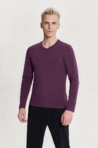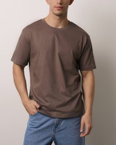 Футболка свободного силуэта. Перед и спинка цельнокроеные. Горловина круглой формы. Обтачка горловины из рибаны 1*1. По горловине проложена отделочная строчка. Горловина спинки закрыта тесьмой из основного полотна. Плечо спущено, пройма углублена. Рукав втачной, длина рукава чуть выше локтя.