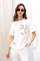 Хлопковая футболка свободного силуэта из трикотажной кулирки. Вырез круглой формы. Свободу движений гарантируют спущенная линия плеча и углубленная пройма. Рукава широкие, чуть выше локтя. Стильная модель!