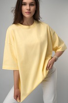 Хлопковая футболка свободного силуэта из трикотажного полотна кулирка. Горловина круглой формы. Свободу движений гарантируют спущенная линия плеча и углубленная пройма. Рукава широкие, чуть выше локтя. Стильная модель!