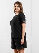 Футболка женская свободного силуэта из трикотажного кулирного пототна. Горловина круглой формы, с широкой обтачкой из рибаны. Плечо спущено, пройма углублена. Рукав втачной, длиной по локоть. Подгибка низа и рукавов широкая.