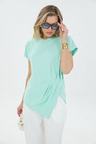 закрыт бейкой из основного полотна. Плечо спущено, пройма углублена. Рукав втачной, длиной по локоть. Подгибки низа футболки и рукавов широкие.