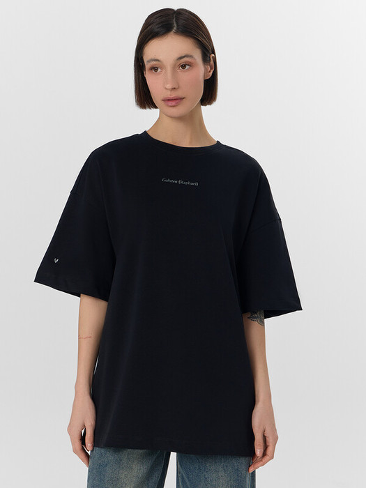 Футболка силуэта оверсайз из трикотажного полотна кулирка. Горловина круглой формы, обтачка горловины из рибаны. Шов горловины спинки закрыт бейкой из основного полотна.