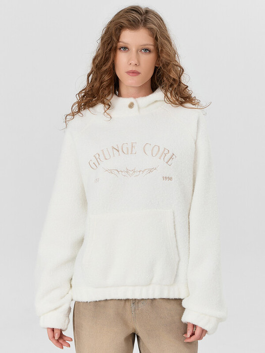 Рукав реглан, длинный, притачан на плоскошовной машине. По низу изделия и рукавов шастрочена резина 40 RV так же на плоскошовной машине. Худи с капюшоном и центральной застежкой. В капюшон вставлен шнур 8KXWC-1 8мм. По центру изделия накладной карман.