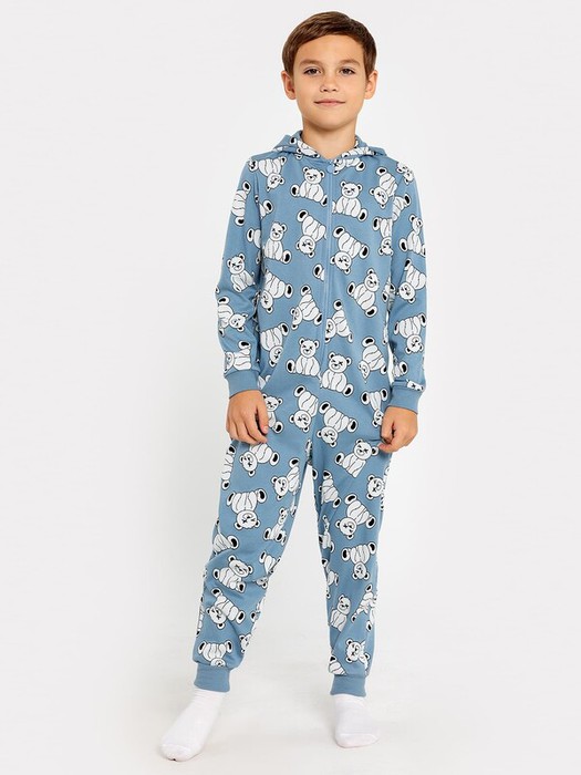 Детский комбинезон из трикотажного интерлока. Комфортный свободный силуэт, уютный капюшон с декоративными ушками из мехового полотна, удобная застежка-молния по центру. Длинные рукава завершаются широкими манжетами, как и штанины. Универсальный домашний комбинезон!