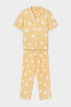 Комплект состоит из рубашки и шорт. Рубашка прямого силуэта, с отложным воротником, спинка цельнокроеная. Плечо слегка спущено. Рукав втачной, одношовный, короткий. Центральная застежка на пуговицы.