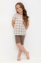 Комплект состоит из рубашки и шорт. Рубашка прямого силуэта, с отложным воротником, спинка цельнокроеная. Плечо слегка спущено. Рукав втачной, одношовный, короткий. Центральная застежка на пуговицы.