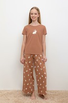 Горловина круглой формы с притачной обтачкой из основного полотна. Рукава длинные втачные. Перед и спинка цельнокроеные. Низ джемпера и рукавов обработан швом в подгибку. Брюки длинные, немного заужены к низу. Пояс цельнокроенный с эластичной тесьмой внутри. Низ брюк застрочен с эластичной тесьмой внутри.