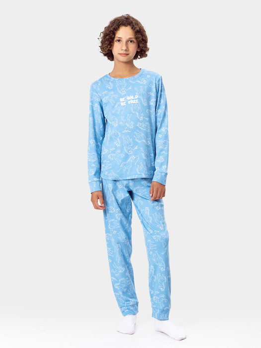 Пижама для мальчиков с надписью "Be wild. Be free" ("Будь диким. Будь свободным") — это комплект для смелых и активных ребят. В набор входит свободный джемпер и прямые брюки, сшитые из мягкой дышащей ткани, которая не раздражает кожу даже во время сна.