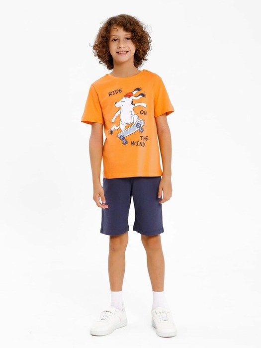 Стильный комплект для мальчиков. Состоит из футболки и шортов. Выполнен из трикотажного кулирного полотна. Футболка прямого свободного силуэта, длиной до середины бедер, с круглой горловиной и короткими рукавами. Шорты длиной до колен или чуть выше, свободные, с боковыми карманами. В пояс из рибаны вставлен регулировочный шнур. Отличный комплект – рекомендуем!