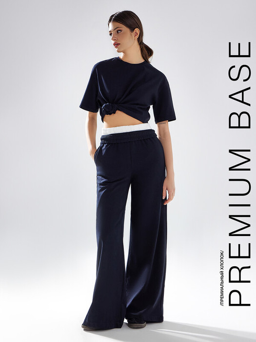 Женский комплект Mark Formelle - удачное вложение в ваш гардероб. Футболка имеет свободный силуэт с круглой горловиной и спущенными плечами, что придает ей расслабленный и стильный вид. Углубленная пройма и короткие рукава обеспечивают дополнительный комфорт и свободу движений. Брюки свободного силуэта немного расширяются к низу, создавая элегантный и удобный образ. Эластичный пояс и боковые карманы делают брюки еще более практичными и удобными для повседневного ношения. Комплект выполнен из мягкой и приятной на ощупь хлопковой кулирки.