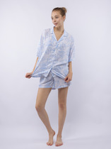 Комплект состоит из джемпера и шорт. Джемпер свободного силуэта. Перед и спинка цельнокроеные. Горловина обработана воротником «поло». Рукава втачные, длиной до локтя, со спущенной линией плеча. Низ изделия и рукава в подгибку. Шорты свободного силуэта, короткие. Перед и спинка цельнокроеные. Пояс цельнокроеный, с втаченной эластичной тесьмой. Низ шорт обработан швом в подгибку..