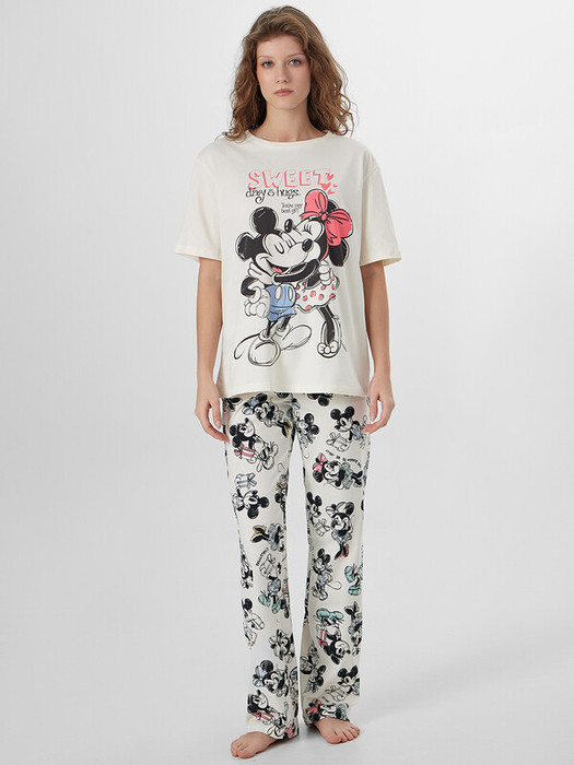 Женская домашняя пижама с надписью «Сладкий день и объятия» и рисунком обнимающихся Микки и Мини Маус подарит ощущение тепла и заботы. Комплект состоит из свободной футболки и прямых брюк. Футболка с овальным вырезом горловины обеспечивает комфорт, а все края аккуратно обработаны.