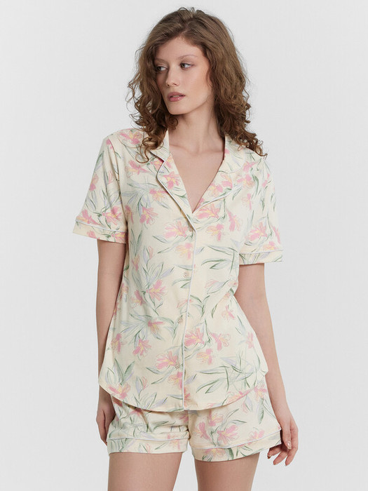 Женская хлопковая пижама свободного силуэта – идеальный выбор для комфортного и стильного отдыха. Рубашка прямого кроя с отложным воротником и лацканами, короткими рукавами и застежкой на пуговицы добавляет элегантности и удобства. Свободные шорты длины мини с эластичным поясом и атласной тесьмой, завязывающейся на бантик, обеспечивают дополнительный комфорт и очарование. Особенностью этой модели являются контрастные канты на рукавах, воротнике и передней части рубашки, что придает ей стильный и утонченный вид. Эта пижама станет отличным вариантом для сна, отдыха и выполнения домашних дел, даря вам комфорт и красоту в каждом моменте. Рекомендуем эту милую модель для самых любимых!