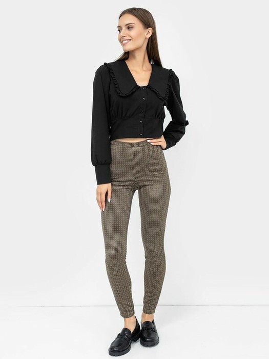 Леггинсы женские прилегающего силуэта из трикотажного полотна академик. Посадка высокая. Пояс отрезной из основного полотна. В боковом шве застежка на потайную молнию. На задней детали вытачки.