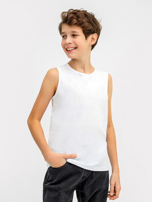 Майка полуприлегающего силуэта из хлопковой трикотажной кулирки. Длина до середины бедер. Горловина круглая, окантована мягкой бейкой. Нижний срез обработан плоским швом. Комфортная классика для вашего мальчика!