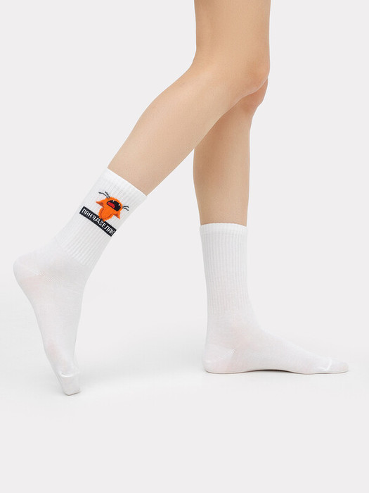 рис.2664 Женский носок с  высоким плотным бортом и рисунком в виде котика с надписью.