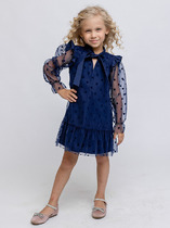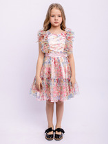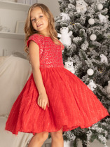 Воздушное нарядное платье для девочек. Выполнено из полупрозрачной сетки с хлопковой подкладкой на нижнем слое. Силуэт А-образный, с отрезными воланами. Вырез классический – круглый, не глубокий. Короткие рукава-фонарики с эластичной тесьмой. На спинке застегивается на пуговицу. Идеально для утренников и праздников!