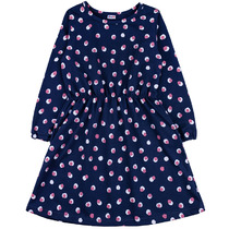 Платье для девочек силуэта трапеция. Рукава короткие цельнокроеные. По низу рукавов притачана рюша из основного полотна. Края рюши обработаны узким швом вподгибку. Низ рюши рукавов обработан швом в подгибку. Горловина круглой формы обработана обтачкой из рибаны. Шов притачивания обтачки закрыт бейкой из основного полотна. Низ платья обработан швом вподгибку на 2-ух игольной плоскошовной машине.