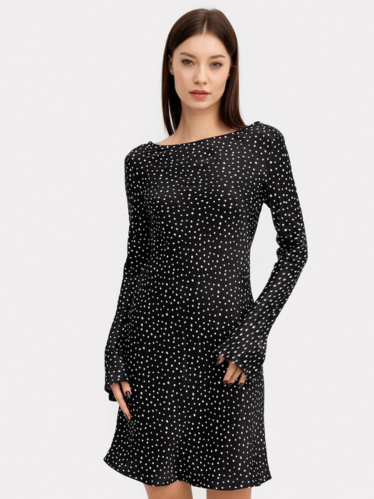 в чистый край. Горловина спинки более вырезана. Рукав втачной длинный, к низу рукав расширяется. Платье длиной выше колена.