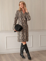 Платье полуприлегающего силуэта, длиной миди. Горловина круглая. Горловина обработана обтачкой из основного полотна. Рукава цельнокроеные короткие. Спинка со средним швом. В среднем шве обработана застежка на петлю (жилка 4мм WT4-4) и пуговицу (D10мм). Нижние срезы платья и рукавов обработаны швом вподгибку с закрытым срезом.