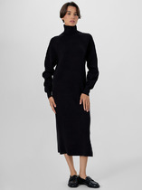 Женское платье с длинными рукавами — элегантная модель для прохладного сезона. Высокий воротник-стойка не только эффектно обрамляет шею, но и надежно защищает холода. Длина ниже колен и рукава, зауженные на манжетах, создают утонченный, вытянутый силуэт. Стильный вырез на левом бедре — вносит в образ ноту современности.