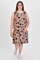 Платье свободного силуэта. Срез переда и спинки обработан обтачкой. На бретелях из основного полотна. На бретелях кольца и регуляторы. На передней детали вытачки. По низу платья притачена рюша, низ рюши обработан в подгибку.