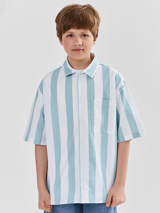 Рубашка для мальчиков прямого силуэта с воротником. По переду обработана застежка на пуговицу d=10mm и петли. На правой детали переда накладной карман. Рукава короткие, втачные, слегка спущены. Нижние срезы изделия и рукавов обработаны швом в подгибку.