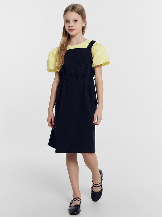 Платье для девочек свободного силуэта на бретелях. По спинке верхнего края платья внутри эластичная тесьма RV20.  Платье отрезное по талии, с кулиской. В ней пробиты петли и протянута эластичная тесьма SFKR-1, с фиксаторами SFFKR-1, образуют сборку. По боковым швам накладные карманы с клапаном. Низ платья обработан швом вподгибку.