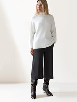 Верхний срез обработан отрезным поясом из основного полотна. Центральная застежка на молнию и пуговицу. Пуговица. На передних половинках обработаны косые карманы от пояса к боковым швам с отрезным бочком. По верхнему срезу заложены по две односторонние складки.
