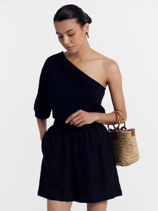 Шорты свободного силуэта, короткие.  Пояс цельнокроеный, с втаченной эластичной тесьмой 40RV. Низ шорт обработан швом в подгибку.