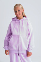 Жакет для мальчиков прямого силуэта с капюшоном. Капюшон на подкладке из основного полотна. Шов втачивания капюшона закрыт х/б тесьмой. Рукава втачные, линия плеча спущена. Притачные манжеты по низу рукавов и притачной пояс из рибаны. По переду застежка молния, карман кенгуру.
