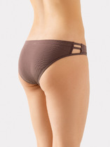 Трусы женские, средняя линия  талии, силуэт - бразилиано. Передняя и задняя детали выполнены из рибаны. Верхний срез трусов обработан бейкой поперечной из рибаны, внутри жилка 6мм. Нижние срезы обработаны бейками поперечными из рибаны. Подкладка ластовицы из хлопка, отлетная по верхнему срезу. Посередине бейки по верхнему срезу передней и задней детали застрочена «птичка».