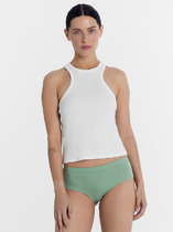 Трусы женские, средняя линия талии, силуэт - бразилиано. Передняя и задняя детали выполнены из трикотажного эластичного полотна YD 070455 140 120 01 10. Подкладка ластовицы из хлопка, верхний срез отлетной. По верхнему срезу трусов и по ножкам тесьма с зубом devsel 11635-10К. на задней детали посередине декоративная сборка (жилка 6мм. с изнаночной стороны).