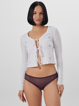 Трусы женские, средняя линия  талии, силуэт - бразилиано. Передняя и задняя детали выполнены из рибаны. Верхний срез трусов обработан бейкой поперечной из рибаны, внутри жилка 6мм. Нижние срезы обработаны бейками поперечными из рибаны. Подкладка ластовицы из хлопка, отлетная по верхнему срезу. Посередине бейки по верхнему срезу передней и задней детали застрочена «птичка».