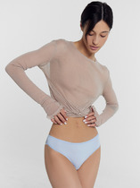 Трусы женские, силуэт бразилиана, из эластичного полотна сетка, со средней посадкой. Передняя деталь из сетки, декорирована в верхней части деталью из широкого эластичного кружева. Подкладка ластовицы из кулирной глади настрочена по переднему срезу. Нижние срезы обработаны эл тесьмой 4 мм (жилка тканая WТ4-4) на оверлоке.