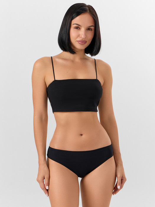Трусы женские, средняя линия талии, силуэт - бразилиана, выполнены из трикотажного кулирного полотна в сочетании с эластичным кружевом. Передняя деталь цельная. Подкладка ластовицы из основного полотна, отлетная по верхнему срезу. Задняя деталь со средним швом, декорирована эластичным кружевом. В верхней части выполнено декоративное отверстие. Срезы кружева обработаны эл тесьмой 6 мм (жилка тканая Wt4-6 , девсел 13460 W).
