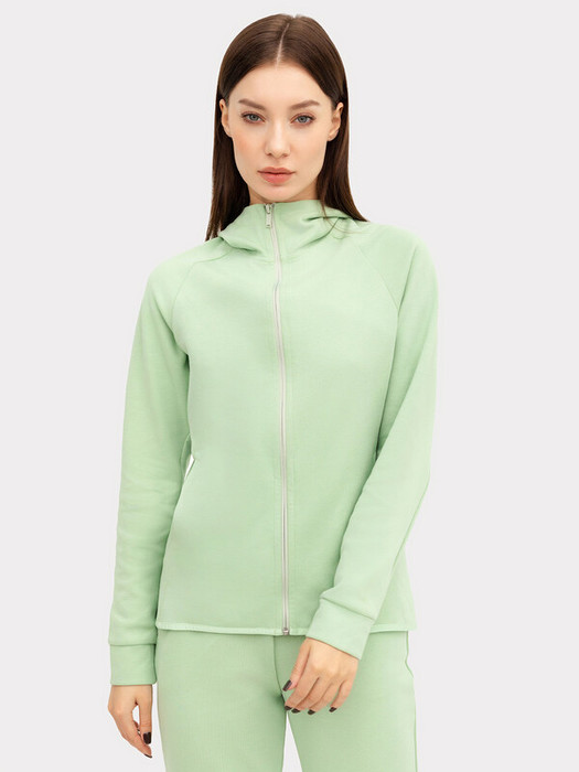 Жакет женский выполнен из трикотажного полотна. Жакет прямой свободный с отрезными бочками. Капюшон 2-х шовный с отрезной обтачкой. Шов втачивания капюшона закрыт тесьмой хб. Рукава  реглан 2х шовные с локтевым швом, на манжете из основного полотна.