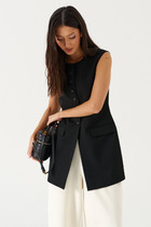 Жилет оверсайз из футера с начесом со спущенным плечом и V-образной горловиной, длиной до линии бедер.